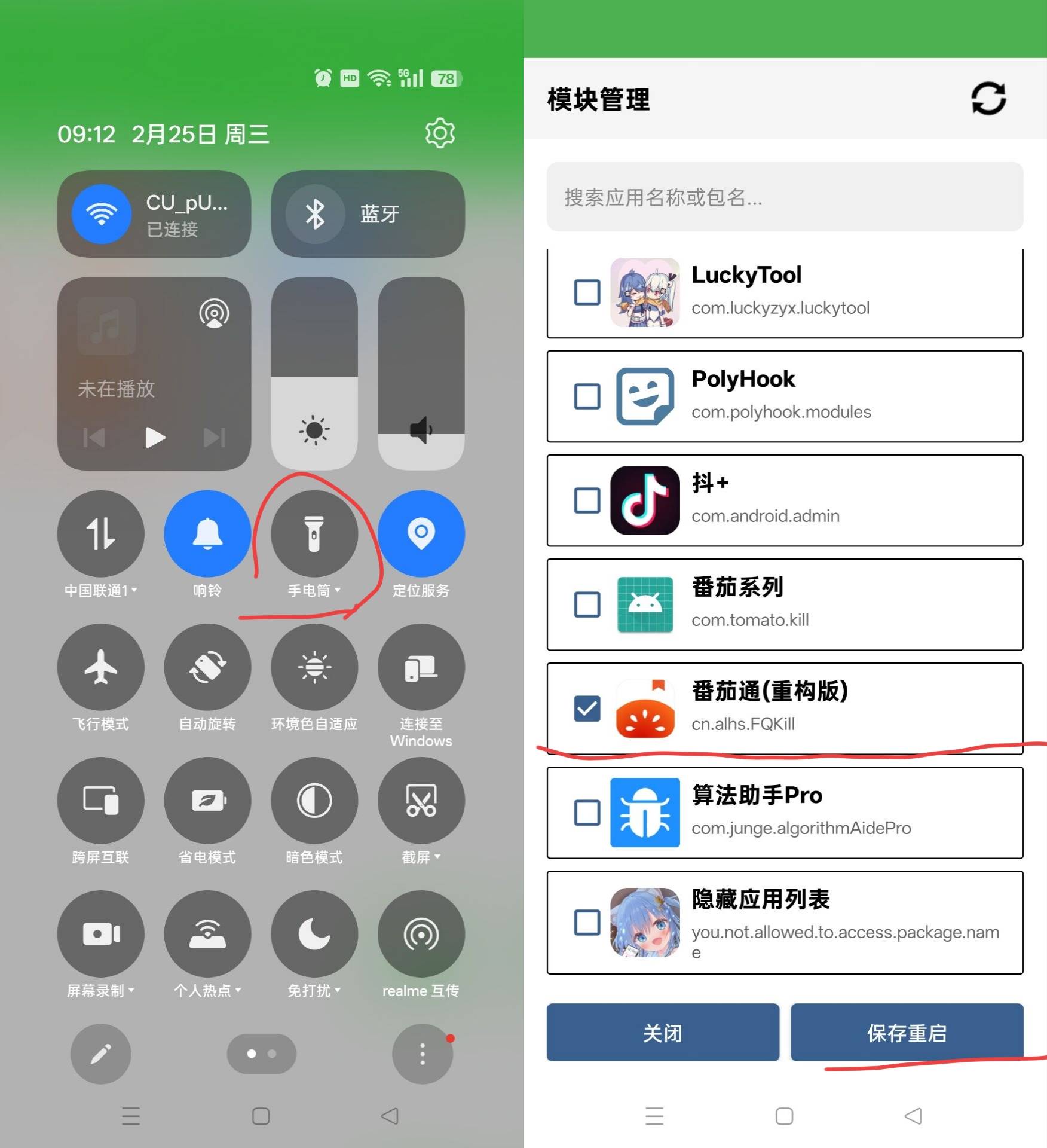 5.勾选上番茄通模块保存重启记得关闭手电筒